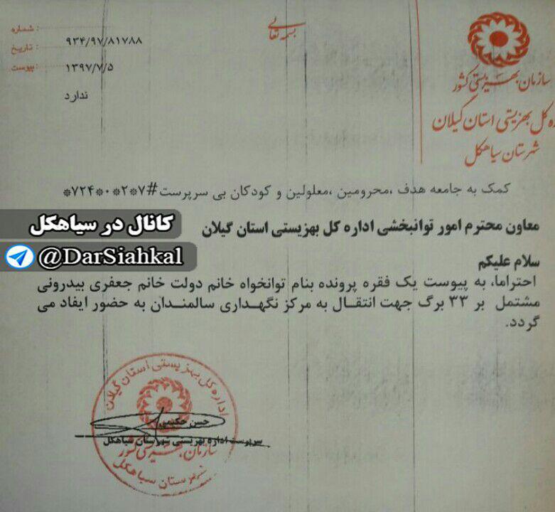 مراحل انتقال پیرزن سیاهکلی به خانه سالمندان درسیاهکل به اتمام رسید+تصویر نامه