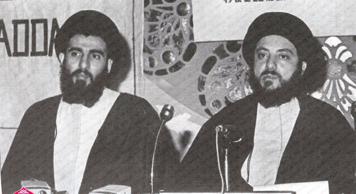مرحوم شهید حکیم و آیت‌الله هاشمی شاهرودی در کنفرانس “جنایات صدام” در دهه شصت