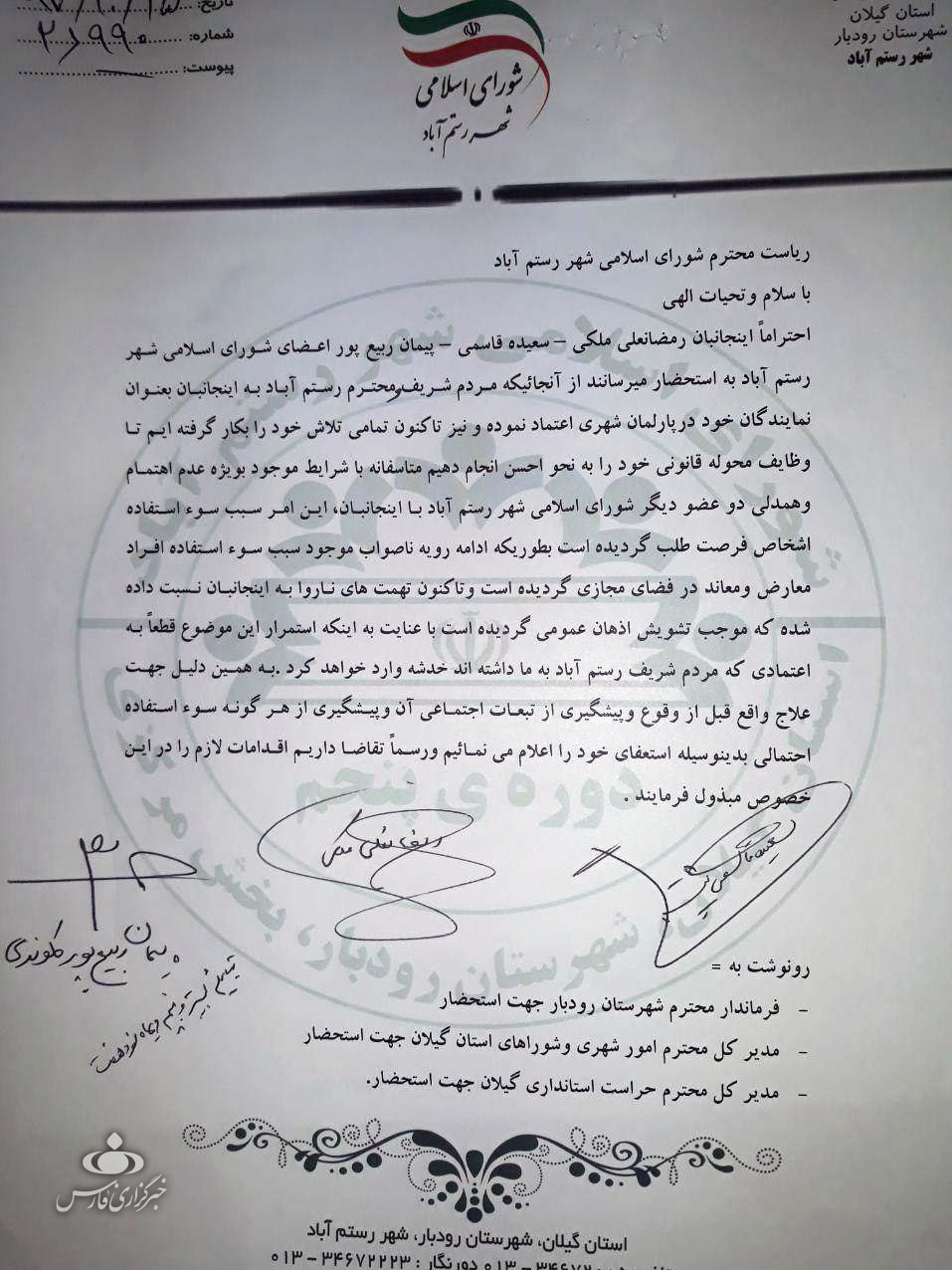 متن نامه استعفا سه عضو شورای اسلامی شهر رستم‌آباد را در زیر بخوانید: