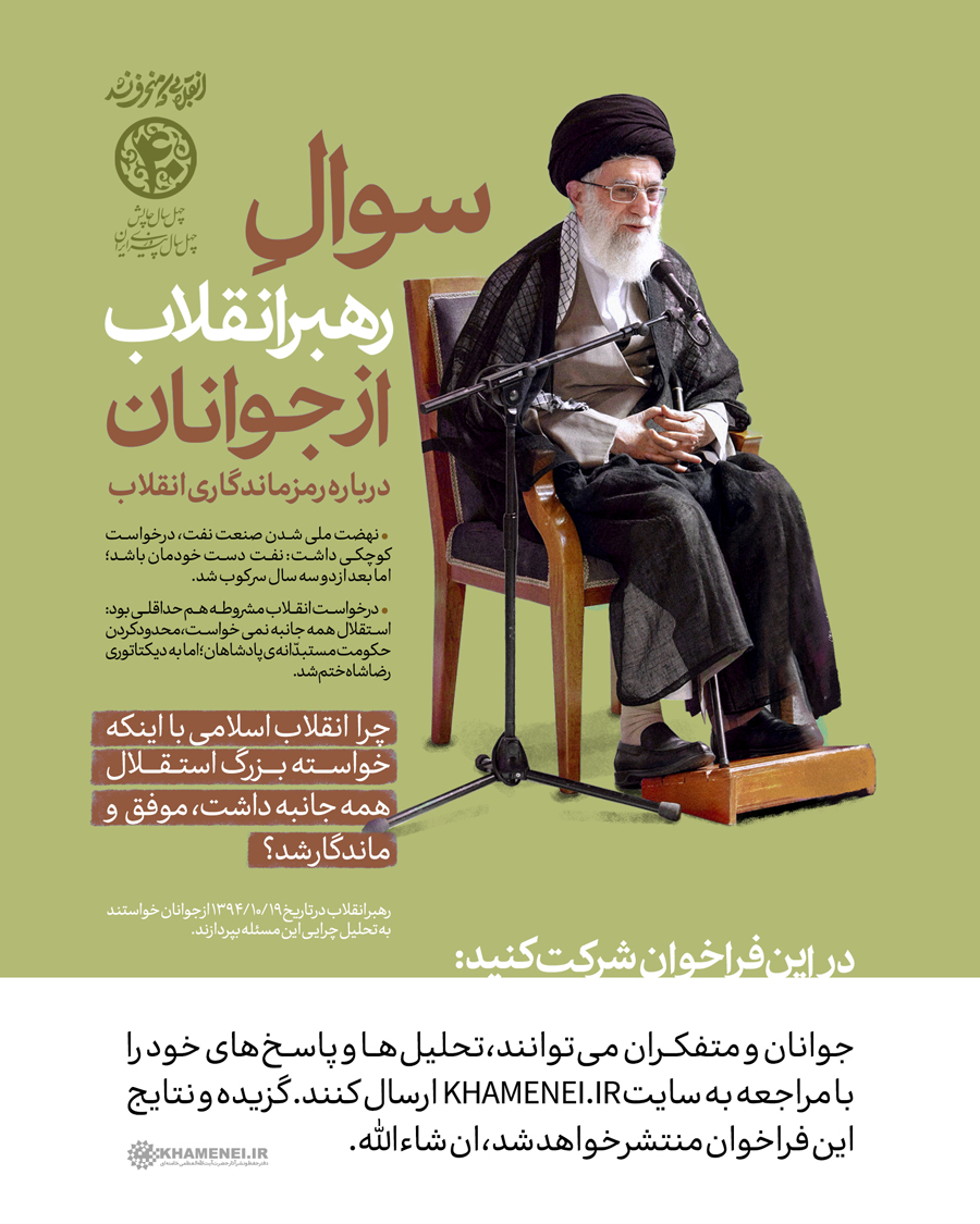 پایگاه اطلاع‌رسانی دفتر حفظ و نشر آثار مقام معظم رهبری درباره سؤال ایشان از جوانان درباره رمز ماندگاری انقلاب فراخوان داد.