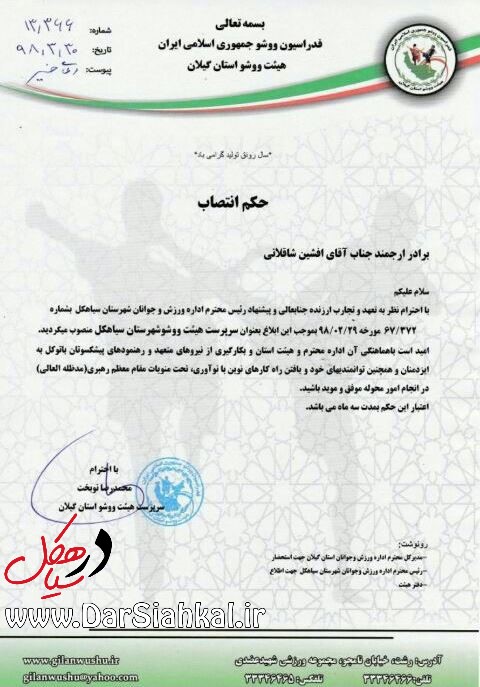 با معرفی اداره ورزش و جوانان سیاهکل و با حکم سرپرست هیئت ووشو استان گیلان؛ افشین شاقلانی به عنوان سرپرست هیئت ووشو شهرستان سیاهکل منصوب شد.