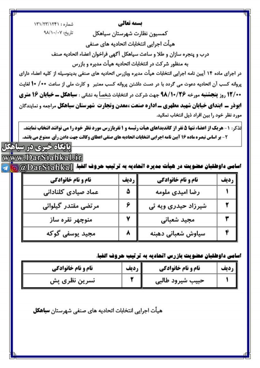 اداره صمت سیاهکلاداره صنعت، معدن و تجارت سیاهکلانتخابات اتحادیهانتخابات اصنافانتخابات صنفیصنف درب، پنجره سازان، طلا و ساعت