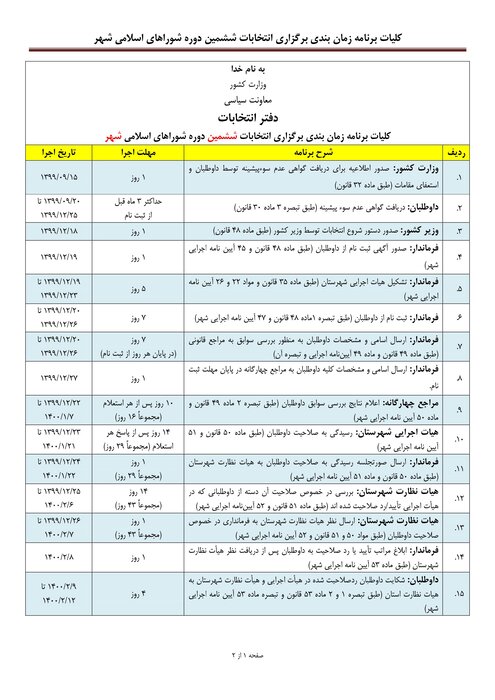 برنامه زمان‌بندی برگزاری ششمین دوره انتخابات شورای اسلامی شهر