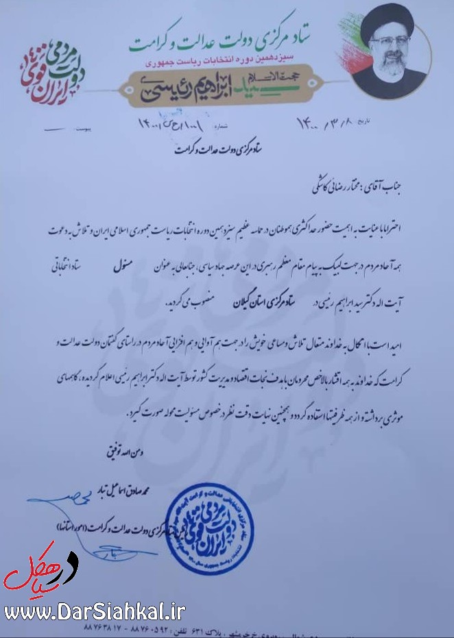 «مختار رضایی کاشکی» مسئول ستاد انتخابات رئیسی در ستاد مرکزی گیلان شد + حکم