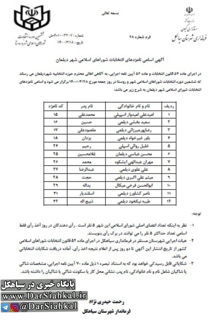 اسامی کاندیداها به ترتیب اعلام فرمانداری سیاهکل: