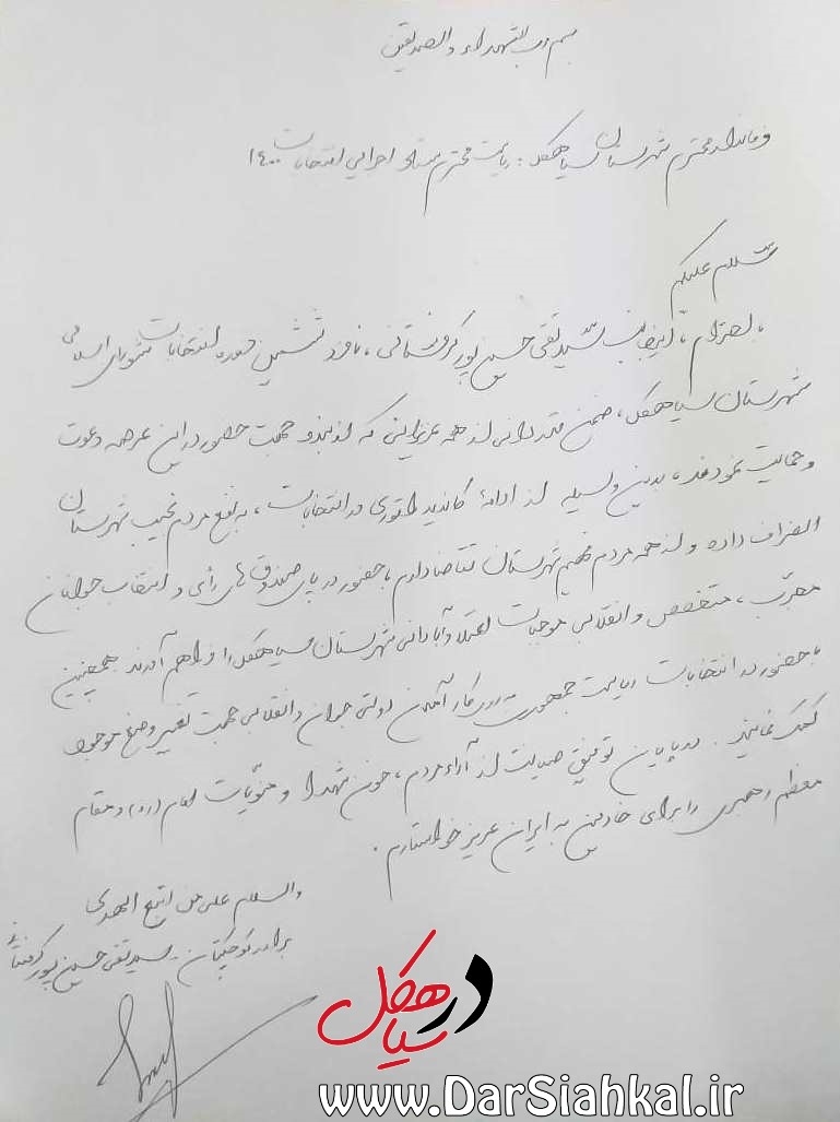 با احترام، اینجانب سید تقی حسین پور کرفستانی، نامزد ششمین دوره انتخابات شورای اسلامی شهر سیاهکل، ضمن قدردانی از همه عزیزانی که از بنده جهت حضور در این عرصه دعوت و حمایت نمودند، بدین وسیله از ادامه کاندیداتوری در انتخابات، به نفع مردم نجیب شهرستان انصراف داده و از همه مردم فهیم شهرستان سیاهکل تقاضا دارم با حضور در پای صندوق های رای و انتخاب جوانان مجرب، متخصص و انقلابی موجبات اعتلا و آبادانی شهرستان سیاهکل را فراهم آورند. همچنین با حضور در انتخابات ریاست جمهوری، به روی کار آمدن دولتی جوان و انقالبی جهت تغییر وضع