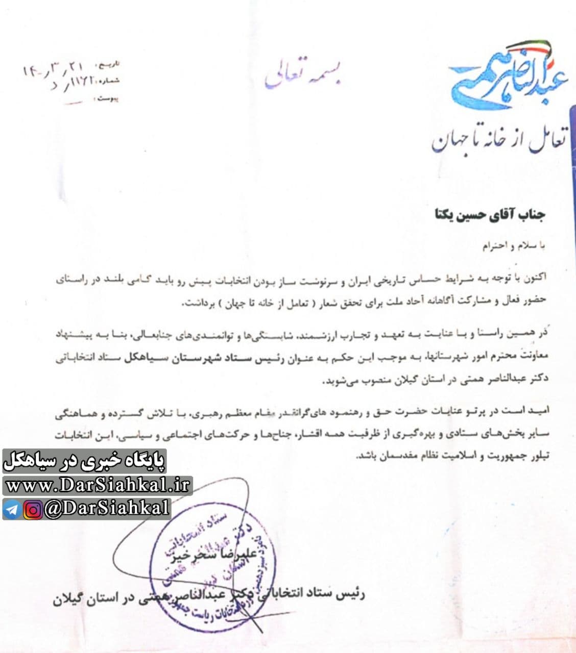 «حسین یکتا» رئیس ستاد انتخاباتی همتی در سیاهکل شد + حکم