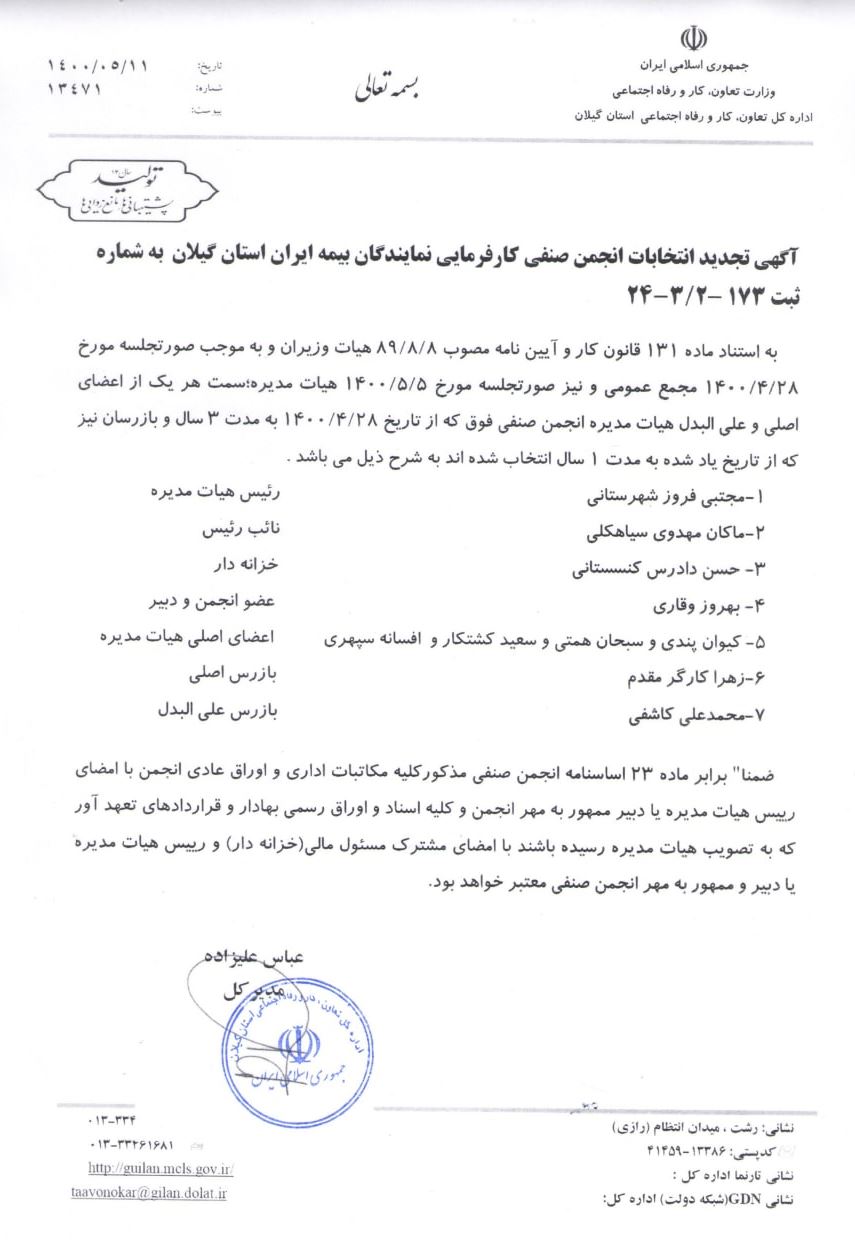 انجمن صنفی نمایندگان بیمه ایرانبیمه ایرانبیمه ایران گیلانماکان مهدویماکان مهدوی سیاهکلنمایندگی بیمه ایرانهیئت مدیره انجمن صنفی نمایندگان بیمه ایران