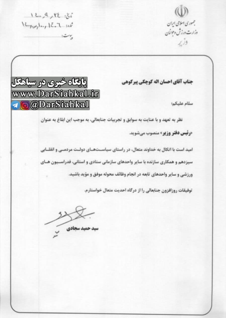 به گزارش پایگاه خبری درسیاهکل، سید حمید سجادی وزیر ورزش و جوانان در حکمی احسان اله کوچکی پیرکوهی را به عنوان رئیس دفتر خود منصوب کرد.