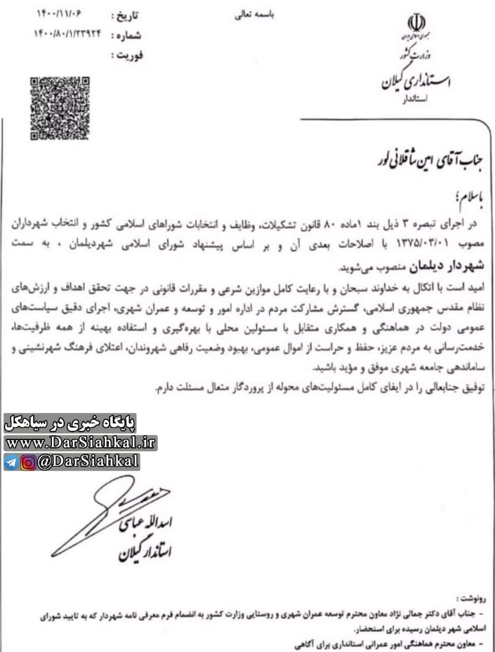 حکم شهردار دیلمان از سوی استاندار گیلان صادر شد + تصویر حکم