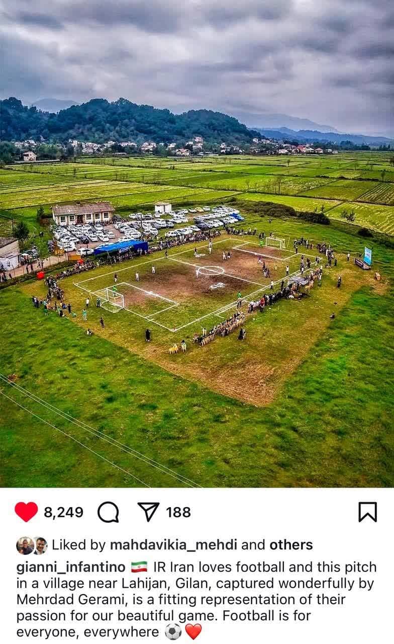 اینفانتینو در پست جالبی از یک زمین فوتبال در لاهیجان نوشت: ایران عاشق فوتبال است و این زمین مسابقه که در روستایی نزدیک لاهیجان در استان گیلان قرار دارد، به خوبی نشان‌دهنده ذوق آن‌ها نسبت به بازی زیبای ماست. فوتبال برای همه در همه جا است.