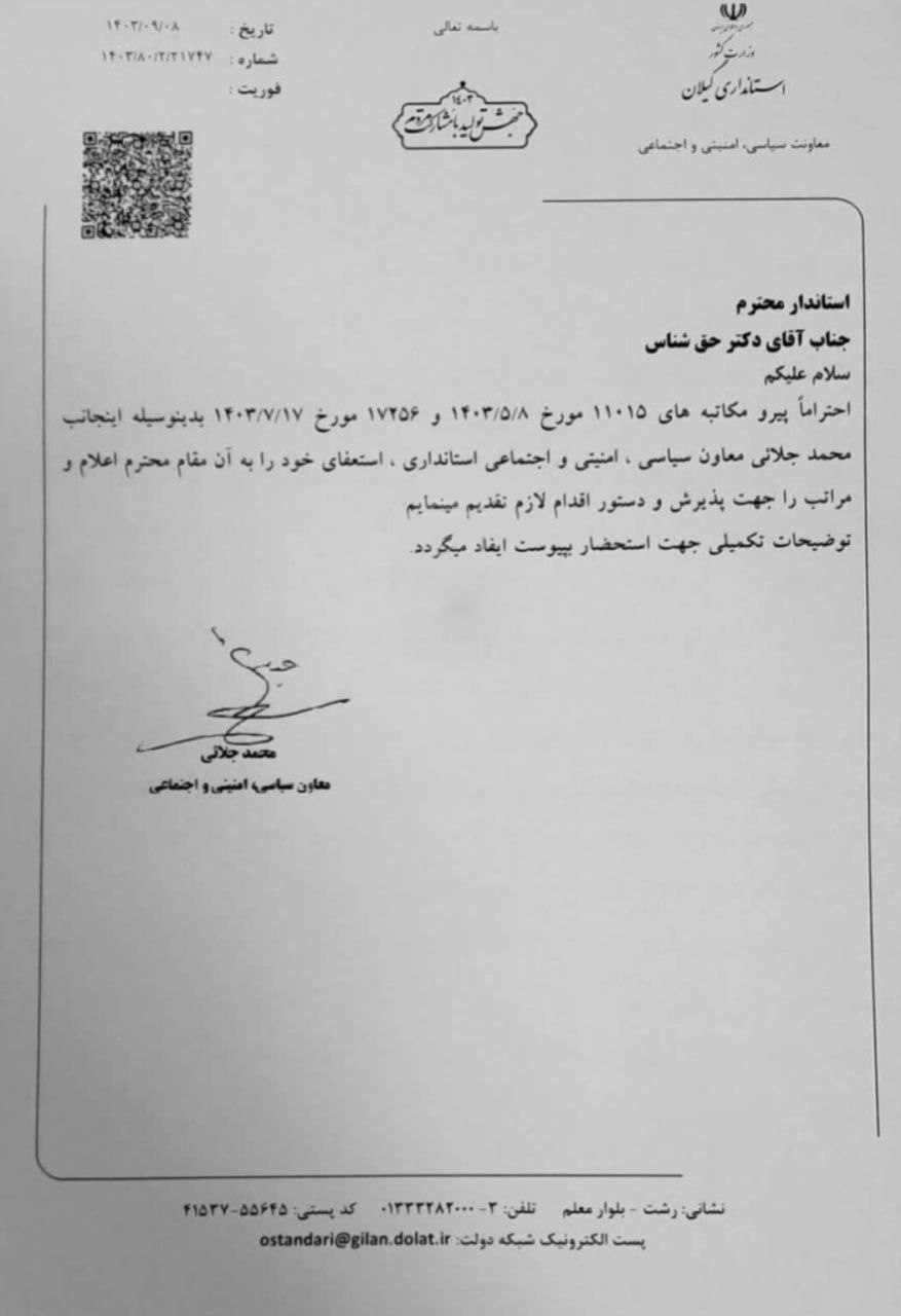 پیش از این، محمد جلائی معاون سیاسی امنیتی استانداری گیلان سومین استعفای کتبی خود را در حالی در تاریخ ۸ آذر ۱۴۰۳ تقدیم استاندار کرد که قبل از آن با این استعفا موافقت نشده بود.