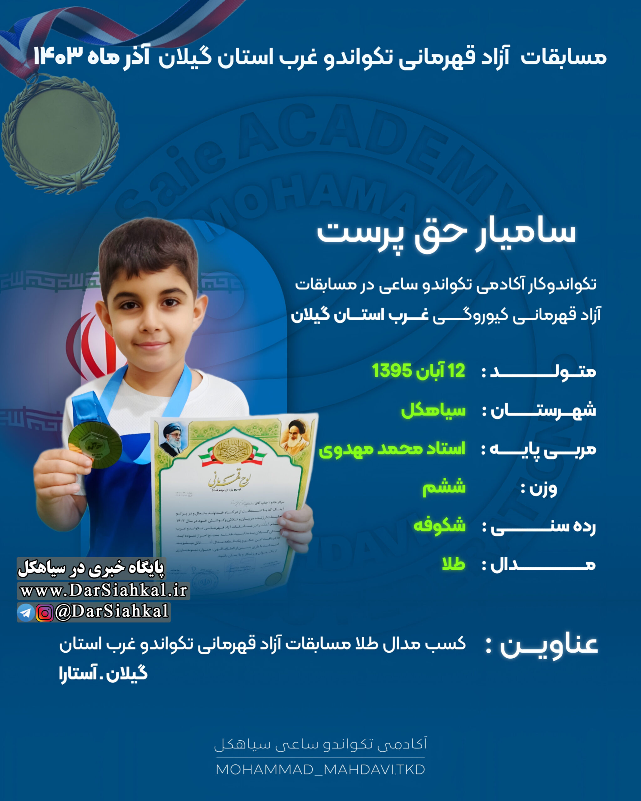 سامیار حق پرست، هیراد عبدالعلی پور، امیر محمد جان درمیان و سید آدرین صادقی مدال طلا و سید حسین امیدوار، کیان نجفی و آرتا دلسوز نیز مدال برنز را برای تیم آکادمی تکواندو ساعی سیاهکل به دست آوردند.