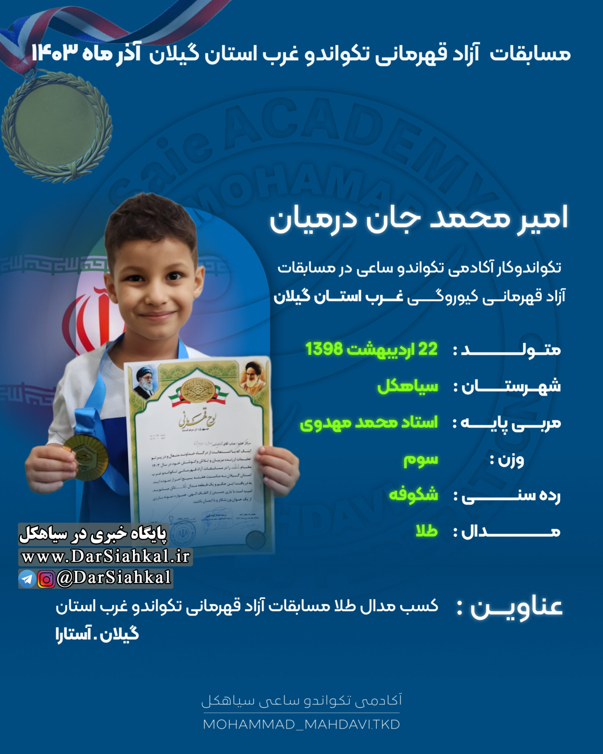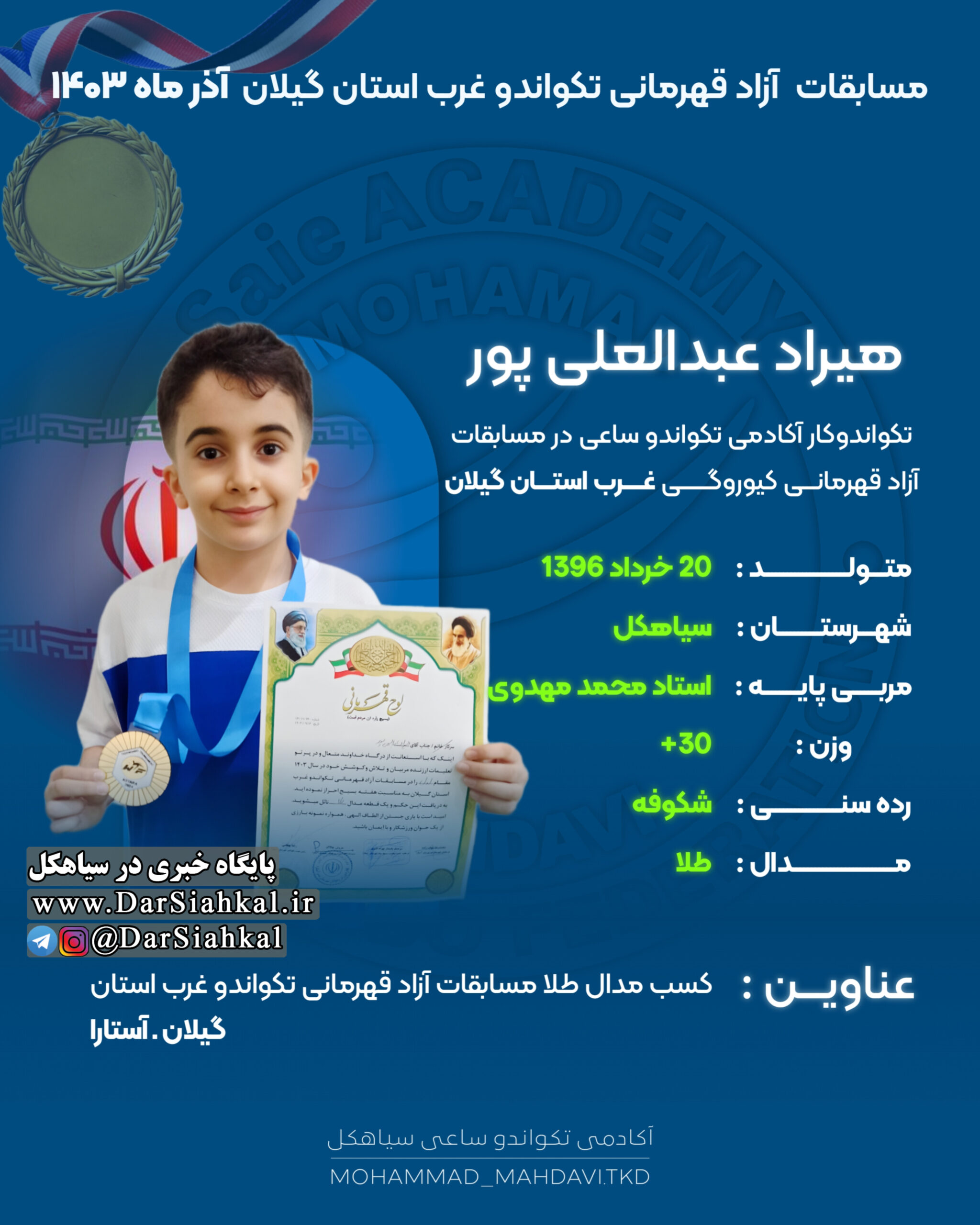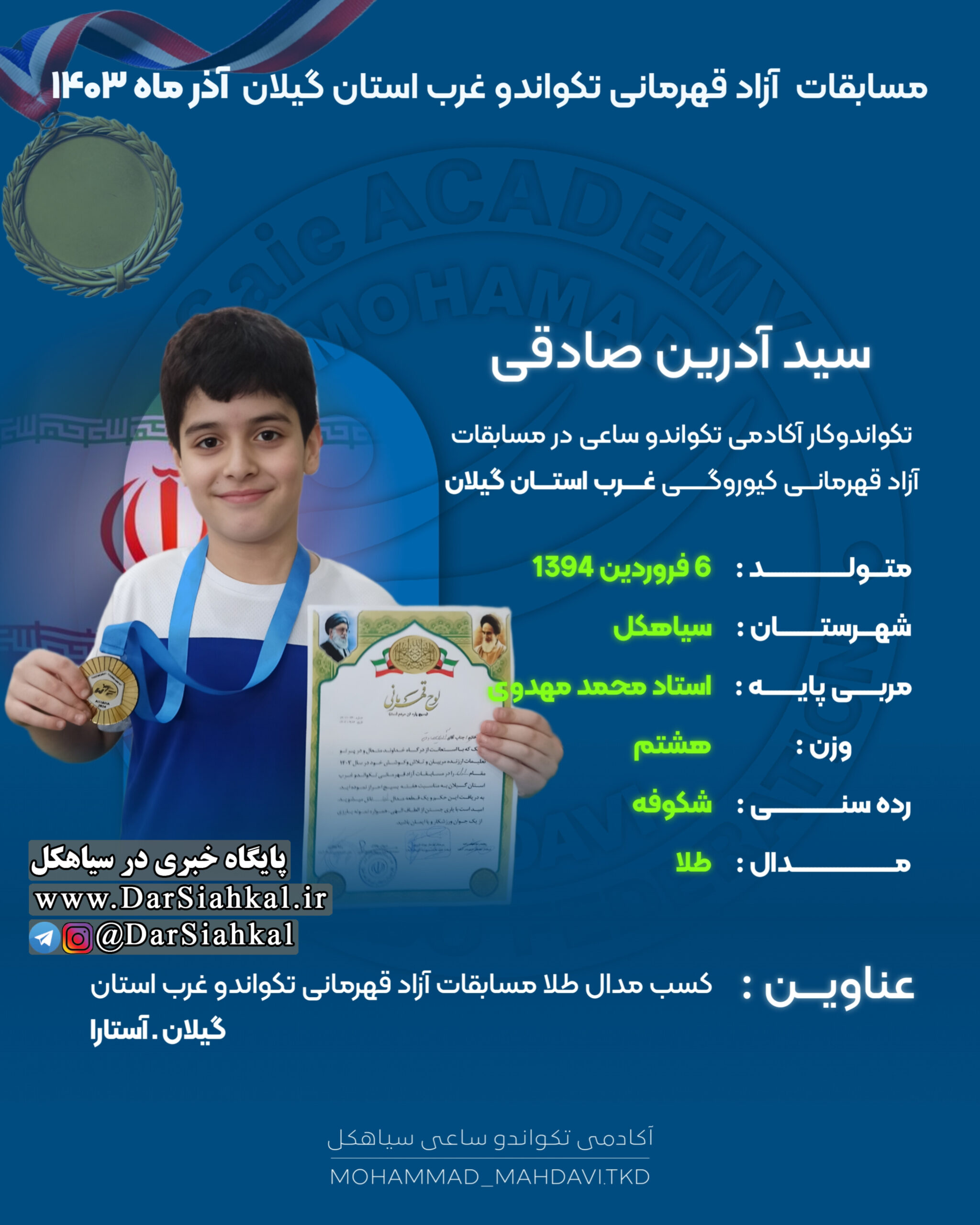 تیم آکادمی تکواندو ساعی از سیاهکل به مربی گری استاد محمد مهدوی با هفت ورزشکار در مسابقات قهرمانی آزاد تکواندو کیوروگی غرب استان گیلان شرکت کرد و تمامی آن ها موفق به کسب مدال شدند.