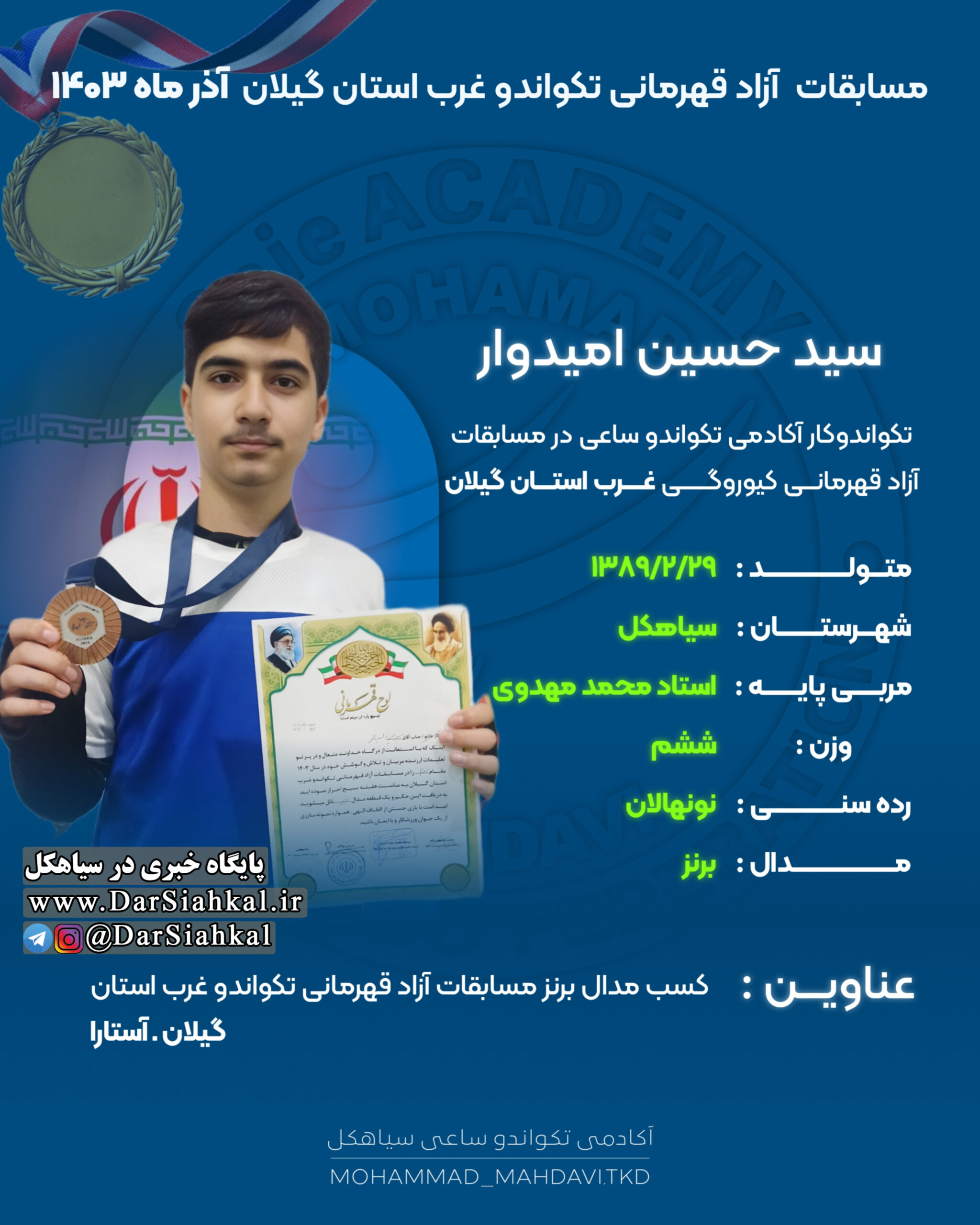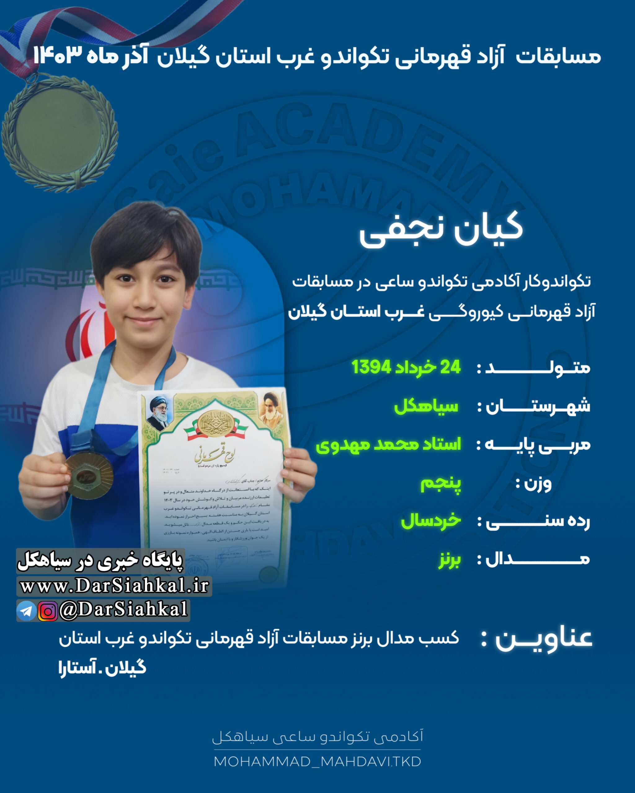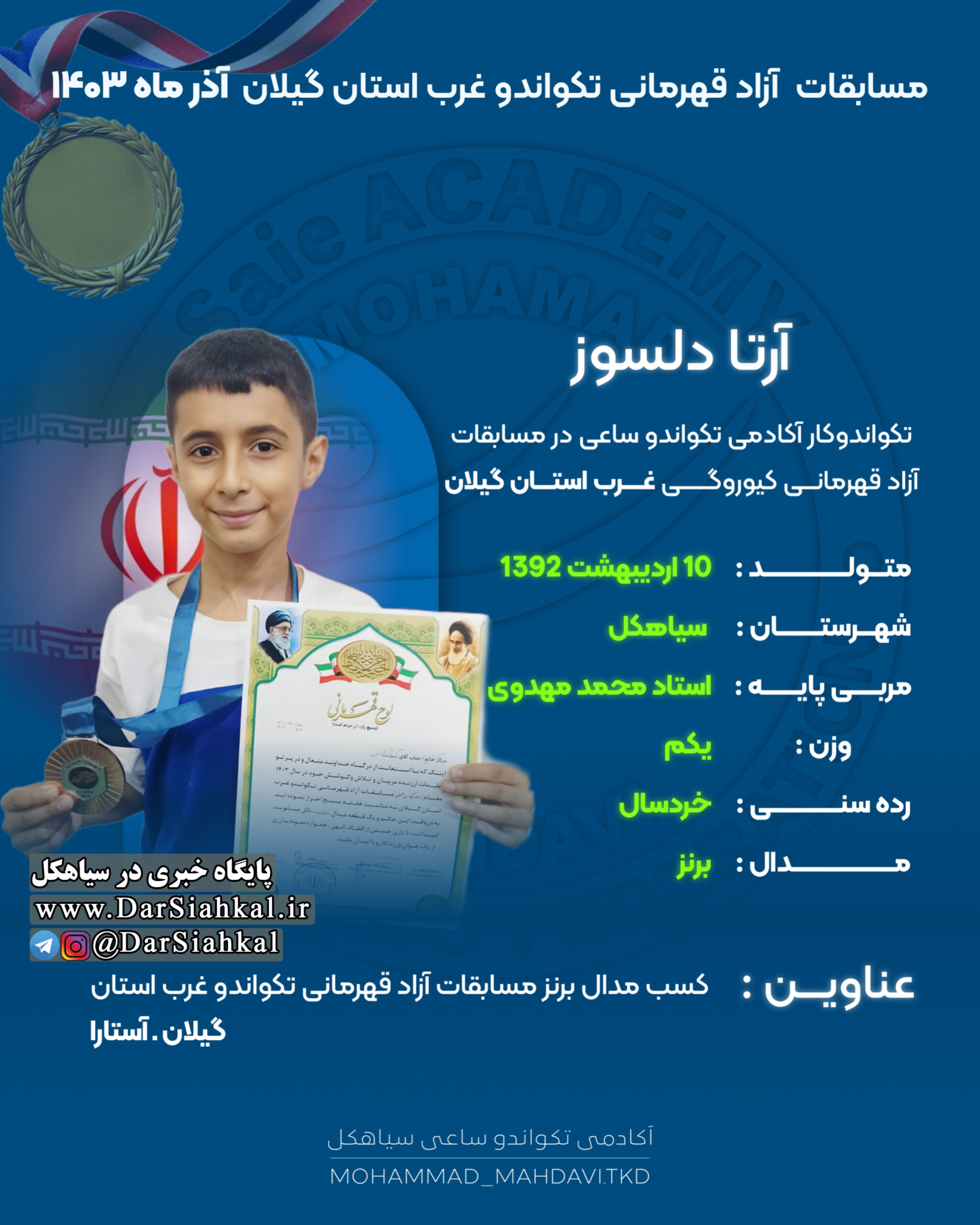 تیم آکادمی تکواندو ساعی از سیاهکل به مربی گری استاد محمد مهدوی با هفت ورزشکار در مسابقات قهرمانی آزاد تکواندو کیوروگی غرب استان گیلان شرکت کرد و تمامی آن ها موفق به کسب مدال شدند.