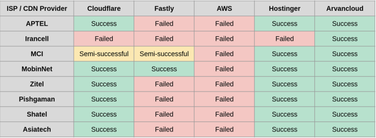 بررسی‌های کارشناسان گزارش کیفیت اینترنت نشان می‌دهد که در شبکه ایرانسل، تمامی درخواست‌های HTTP3 به خارج از کشور با اختلال کامل همراه است. در شبکه‌ی همراه اول درخواست‌های مربوط به دو سرویس‌دهنده Cloudflare و Fastly اختلالات مقطعی دارند ولی در مقاطعی بدون مشکل هستند. همچنین درخواست‌های HTTP3 به مقصد سرویس‌دهنده AWS با اختلال کامل همراه بوده است.