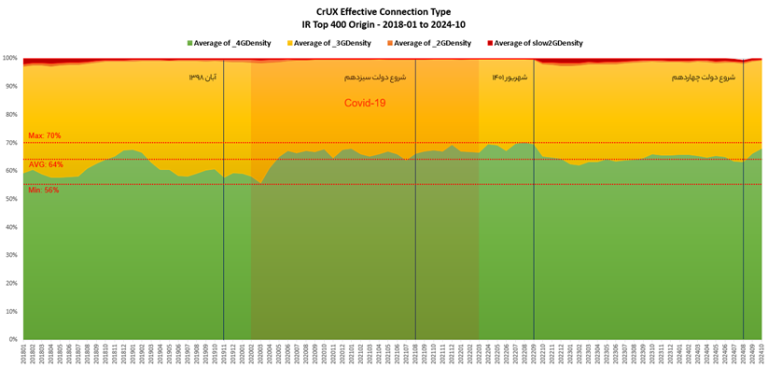 کیفیت اینترنت ایران نسبت به گزارش قبلی در تیر ۱۴۰۳، تفاوت چشم‌گیری نداشته و همچنان در وضعیت خطرناک است؛ نتیجه‌ی تداوم سیاست‌های محدودکننده‌ی داخلی، تحریم‌های یک‌جانبه‌ی خارجی و مشکلات گسترده در شبکه Access منجر به این شده است که هم‌چنان تجربه کاربری اینترنت در ایران با سه گزاره‌ی کند، پر اختلال (دومین کشور از انتهای جدول بعد از میانمار و اوکراین) و محدود (بعد از چین در جایگاه ۹۹ از ۱۰۰ کشور) توصیف شود. در مجموع بر اساس گزارش Google Crux کیفیت اینترنت ایران در رتبه‌ی ۹۱ و طبق داده‌ی ooni در رتبه ۹۹ از ۱۰۰ کشور است. در تجمیع این دو شاخص، ایران در جایگاه ۹۵ از ۱۰۰ کشور ایستاده است.