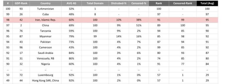داده‌های گزارش چهارم کیفیت اینترنت نشان می‌دهد که ایران پس از چین، محدودترین اینترنت جهان را دارد. برای رسیدن به این نتیجه، کارشناسان انجمن تجارت الکترونیک، ۱۰۰ دامنه اینترنتی Origin را با استفاده از پایگاه داده‌ی OONI بررسی کرده‌اند. سپس دامنه‌هایی که بیشترین پوشش را میان این کشورها داشتند را معیار قرار دادند. نتیجه آن شده است که در آبان این سال، تعداد دامنه با فیلترینگ یا اختلال بالای ۵۰ درصد در مقایسه با مدت مشابه سال گذشته تغییر معناداری نداشته است.