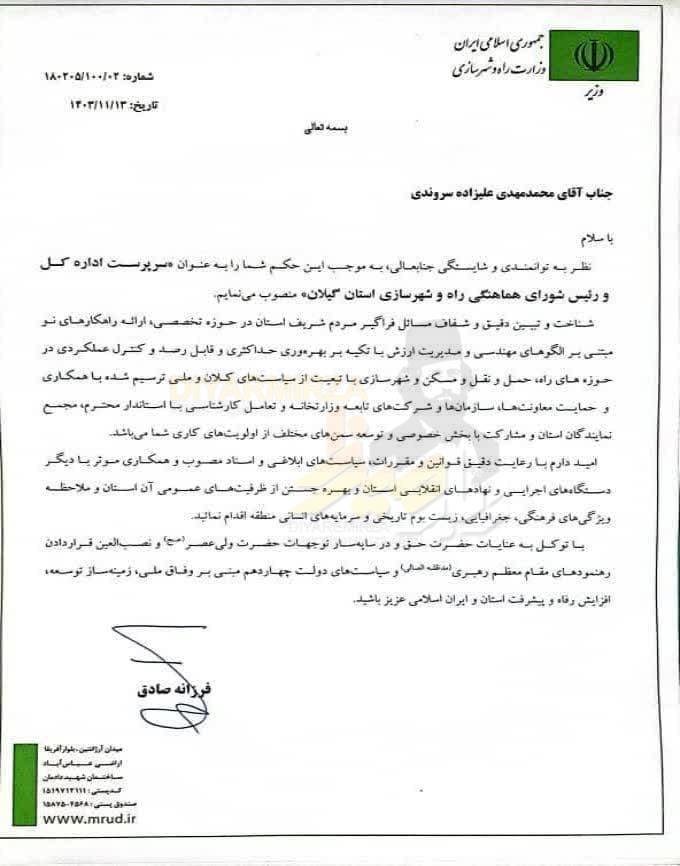 وزیر راه و شهرسازی با صدور حکمی محمدمهدی علیزاده سروندی را به عنوان سرپرست اداره کل و رئیس شورای هماهنگی راه و شهرسازی استان گیلان منصوب کرد.