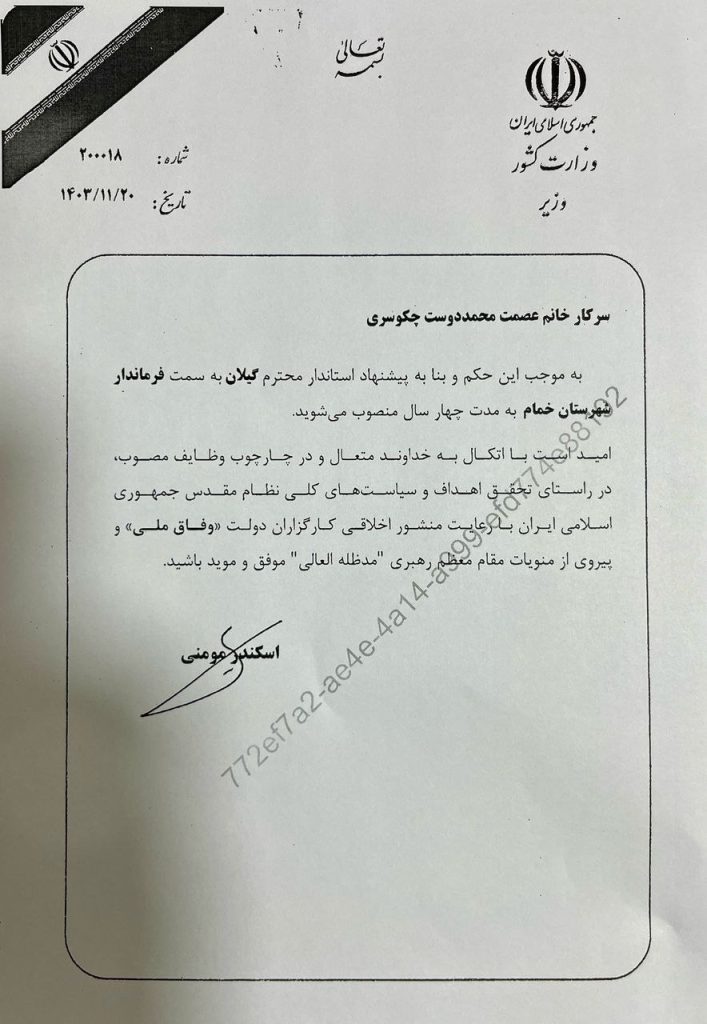 گفتنی است «عصمت محمددوست» از ۸ آذر ۱۴۰۳ با حکم استاندار گیلان به عنوان سرپرست فرمانداری شهرستان خمام منصوب شده بود.