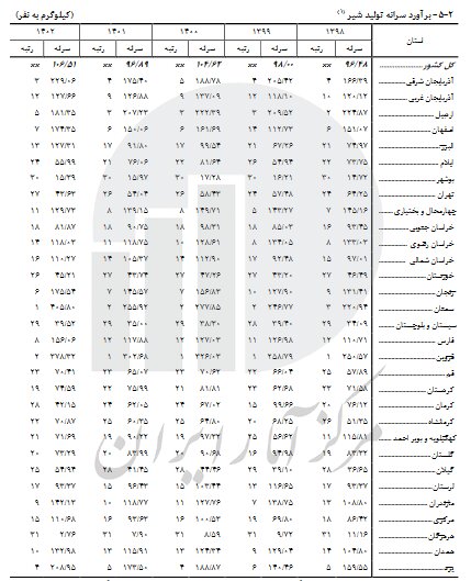 همچنین در بخش دیگری از این آمار به سرانه تولید شیر در استان‌های کشور اشاره شده است. بررسی‌ها حاکی از آن است که در سال گذشته سرانه تولید شیر در کل کشور به ازای هر نفر ۱۰۶.۵۱ کیلوگرم است که نسبت به سال ۱۴۰۱.۹. ۶۲ کیلو گرم به ازای هر نفر افزایش یافته است.