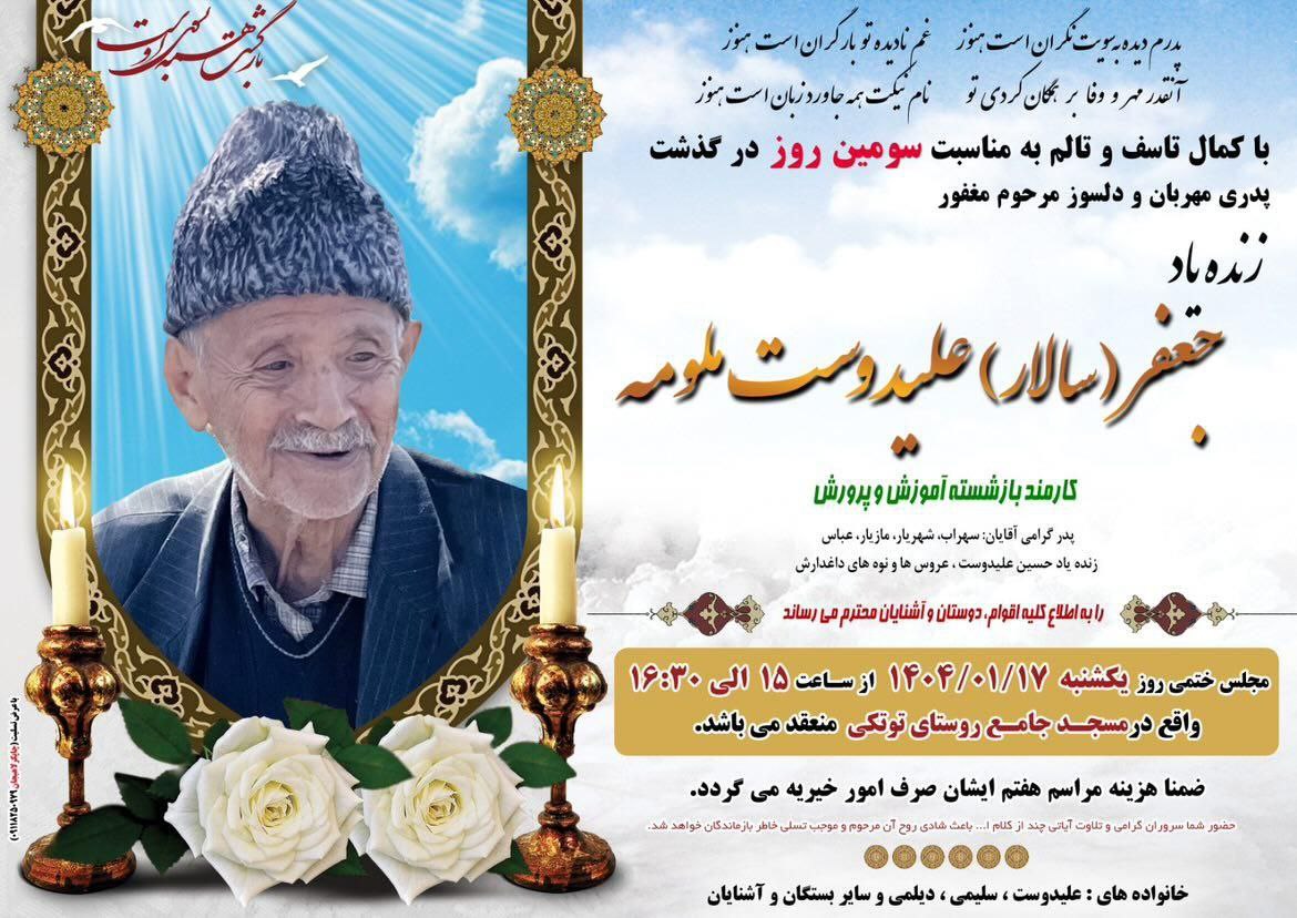 پیکر مرحوم جعفر (سالار) علیدوست ملومه، که از ۲۲ بهمن ۱۴۰۳ در سیاهکل مفقود شده بود، پس از هفته‌ها جست‌وجو، در کانال آب محدوده پل لشکریان پیدا شد. پس از تأیید پزشکی قانونی، هویت وی شناسایی شد. پایگاه خبری درسیاهکل درگذشت این کهنسال را به خانواده ایشان تسلیت عرض می‌کند.