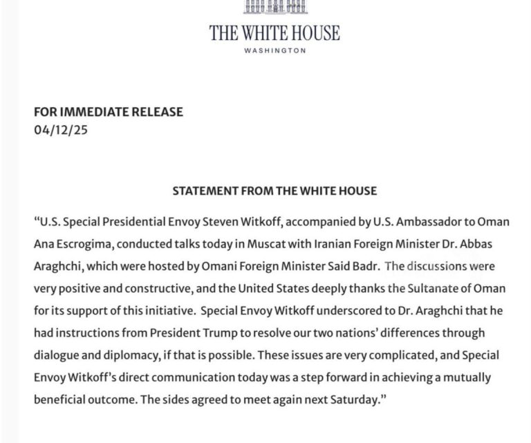 کاخ سفید در بیانیه خود آورده است: «استیون ویتکاف، فرستاده ویژه رئیس‌جمهوری آمریکا به همراه آنا اسکروگیما سفیر آمریکا در عمان امروز در مسقط با دکتر عباس عراقچی وزیر امور خارجه ایران به میزبانی سید بدر البوسعیدی وزیر امور خارجه عمان گفتگو کرد. گفتگوها بسیار مثبت و سازنده بود و آمریکا عمیقاً از کشور عمان برای حمایت از این ابتکار قدردانی می کند.»