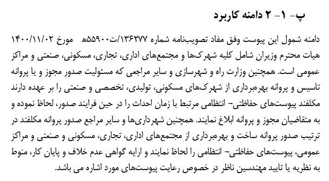 وی افزود: بر این اساس شهرداری‌ها باید هنگام صدور پایان کار به این موارد توجه کنند. دامنه شمول این مقررات شامل شهرک‌ها و مجتمع‌های مسکونی است. برای ساختمان‌های صنعتی و تجاری، همچنین مجتمع‌های تجاری و ساختمان‌های عمومی با چهار واحد و بالاتر این مقررات الزامی است. اما برای ساختمان‌های با کمتر از چهار واحد، لازم‌الاجرا نخواهد بود.