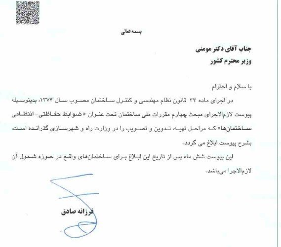 مدیرکل دفتر مقررات ملی ساختمان گفت:‌ آخرین مکاتبه از دادستانی کل کشور در خصوص این موضوع بود که ضوابط حفاظتی-انتظامی ساختمان‌ها به‌کجا رسید و چرا هنوز ابلاغ نشده است.