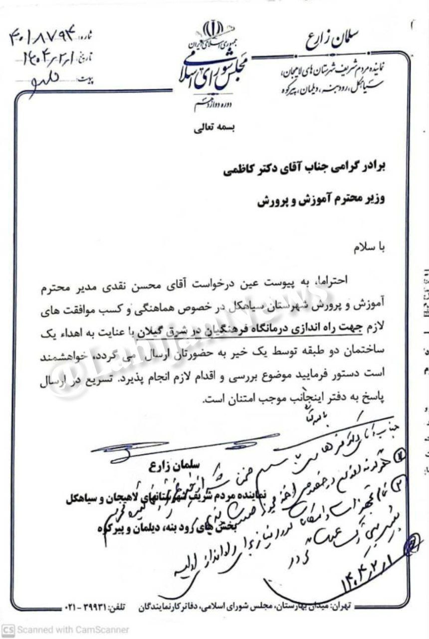 به گزارش پایگاه خبری درسیاهکل به نقل از لاهیجان نیوز، سلمان زارع نماینده مردم شهرستان‌های لاهیجان و سیاهکل در مجلس شورای اسلامی، طی نامه‌ای به وزیر آموزش و پرورش، خواستار تسریع در بررسی و صدور مجوز راه‌اندازی درمانگاه فرهنگیان در شرق استان گیلان شد.