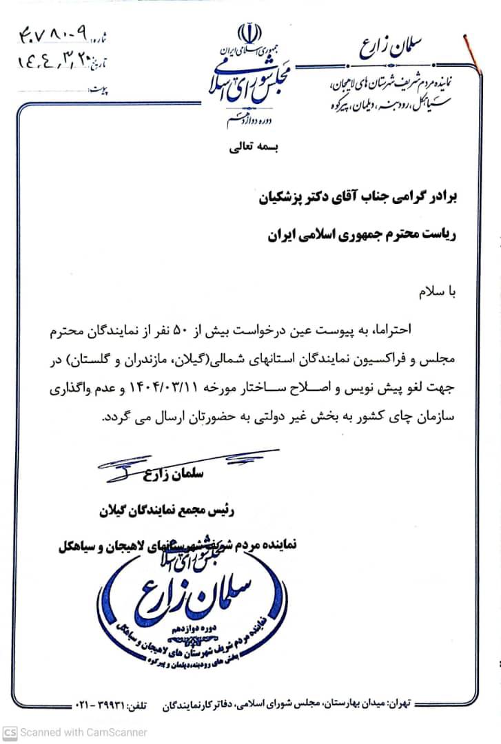 به گزارش پایگاه خبری درسیاهکل، جمعی از نمایندگان مجلس شورای اسلامی از استان‌های گیلان، مازندران و گلستان با ارسال نامه‌ای به دکتر مسعود پزشکیان، رئیس‌جمهور، خواستار توقف فرآیند واگذاری سازمان‌ چای به بخش غیردولتی شدند.