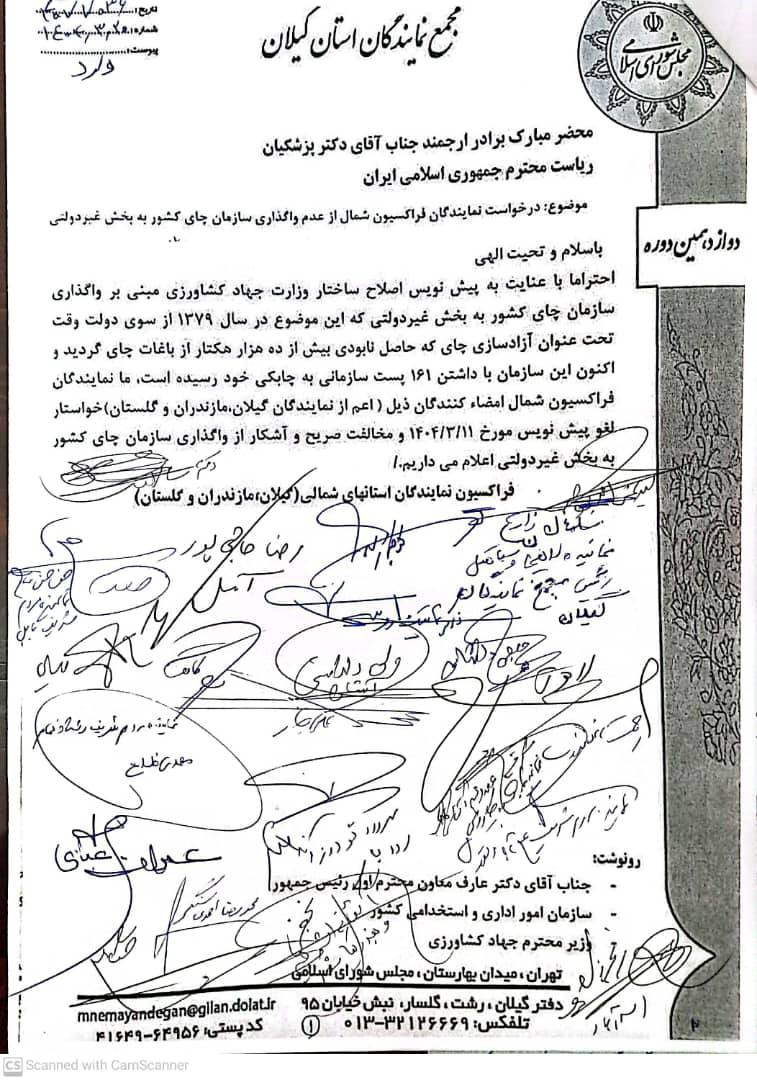 فراکسیون شمال امضاءکنندگان ذیل (اعم از نمایندگان گیلان، مازندران و گلستان) خواستار پیش‌نویس مورخ ۱۴۰۴/۳/۱۱ و مخالفت صریح و آشکار از واگذاری سازمان چای به بخش غیردولتی اعلام می‌داریم.