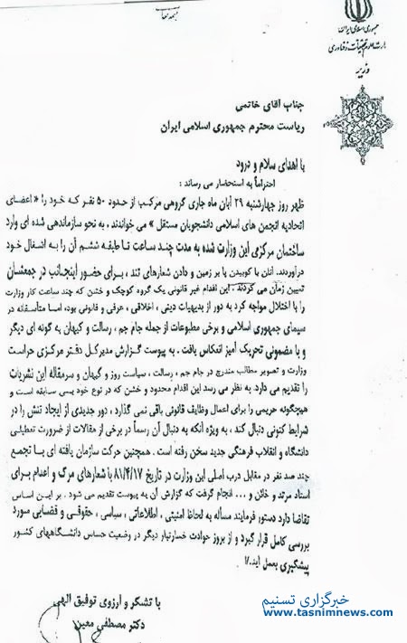 معین در نامه ای به خاتمی خواستار برخورد با دانشجویان انجمن مستقل شده بود.