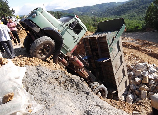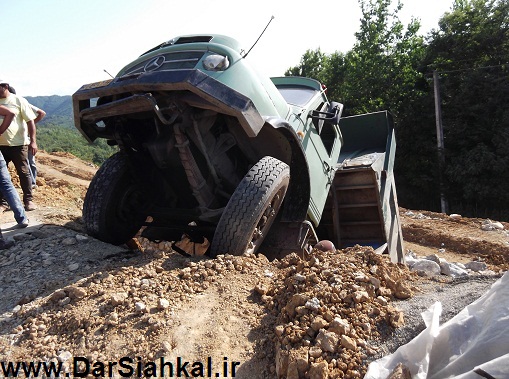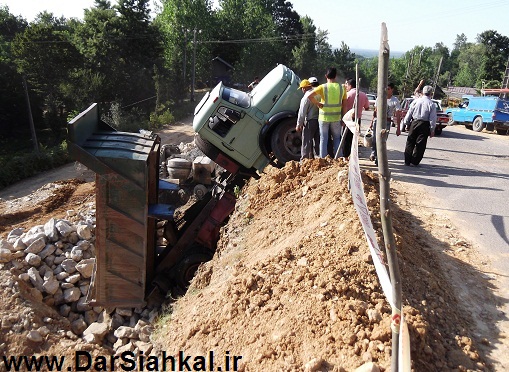 این کامیون در محدوده روستای لمش ، در موقع خالی کردن بار خود که حامل سنگ دیواره جاده بود ، به داخل کانالی که برای ساخت دیواره حفر شده بود سقوط کرد.