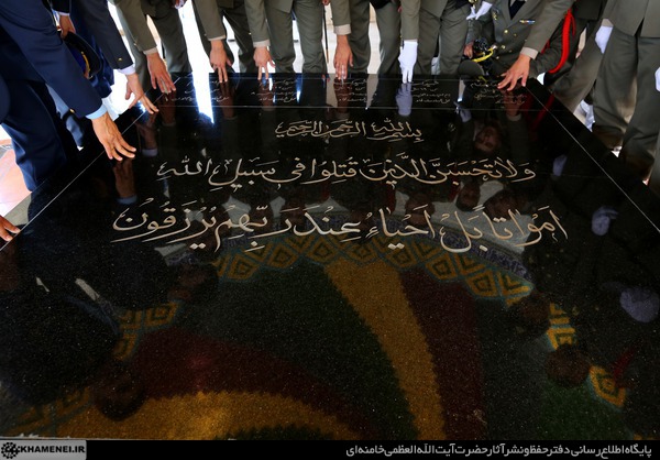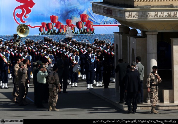 رهبر معظم انقلاب اسلامی در ابتدای ورود به میدان مراسم، با حضور در محل یادمان شهدای ارتش و قرائت فاتحه، علو درجات شهدا را مسئلت کردند.