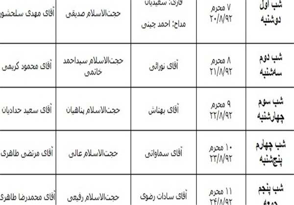 برنامه عزاداری ایام محرم به مدت ۵ شب، همراه با اقامه نماز مغرب و عشا در حضور رهبر معظم انقلاب برگزار خواهد شد.
