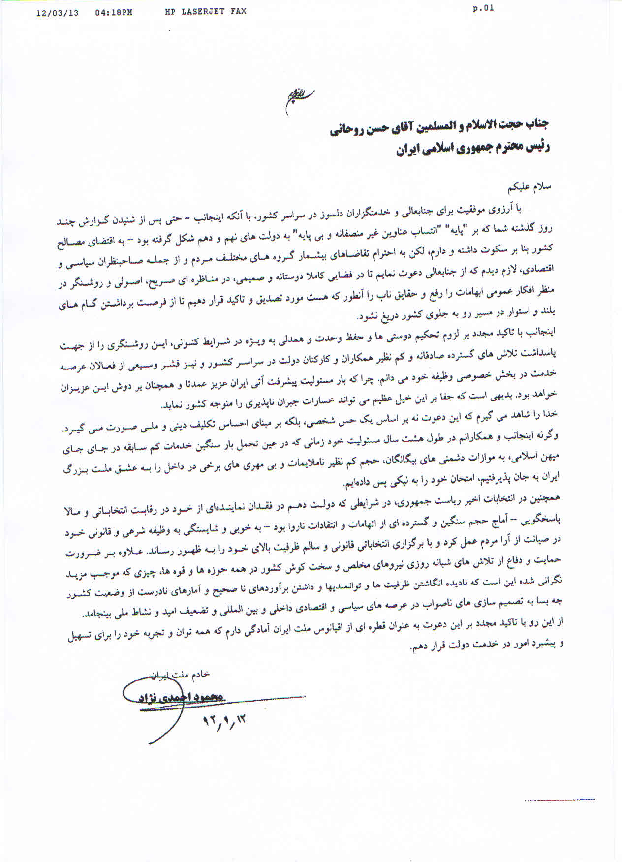 “شما در طول 8 سال ریاست جمهوری تان ، هرگز پاسخگویی پیشه نکردید و به جز گفت و گوهای تشریفاتی با مجریان معرف حضور صدا و سیما ، با هیچ رسانه داخلی گرفت و گوی اختصاصی و چالشی نداشتید و این در حالی است که با خبرنگاران و رسانه های درجه چندم خارجی ، بارها گفت و گوهای اختصاصی داشتید. حتی در سال 1388 نیز که آقای روحانی شما را دعوت به مناظره کرد ، آن را نپذیرفتید. حتی همین چند روز پیش نیز ، حاضر نشدید برای پاسخگویی ، به دادگاه قانونی در جمهوری اسلامی بروید. حال چه شده که اهل پاسخگویی در مناظره شده اید؟ البته همه ما می دانیم که علت چیست و سودای موج سواری سیاسی با طرح موضوعات مختلفی که مناظره ، آغاز آن است ، محرک اصلی این ماجراست ولی با این همه ، اصل را بر صحت می گذاریم و از جنابعالی می خواهیم قبل از این که با رئیس جمهور کشور که خود بهتر از بقیه می دانید چقدر مشغله کاری دارد ، مناظره کنید ، به دانشگاه تهران بیایید و ابتدا با نمایندگان دانشجویان مناظره کنید و برای اولین بار ، در فضایی جز فضای یک سویه صدا و سیما ، به پرسش های صریح و بی پرده ما درباره عملکرد و رفتارتان در آن 8 سال پاسخ دهید و در همان جا به طور مستقیم ، واکنش دانشجویان به ادعاهای تان را اعم از رد یا قبول ببینید و سپس به مناظره با افراد دیگر بیندیشید.”