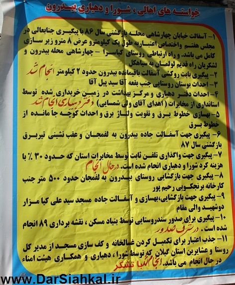 به گزارش خبرنگار درسیاهکل، در یک اقدام جالب توجه، در هنگام افتتاح ساختمان دهیاری بیدرون، تمامی خواسته ها و مشکلات این روستا بر روی یک بنر چاپ شده و در معرض دید مسئولین و بازدیدکنندگان قرار گرفته بود.