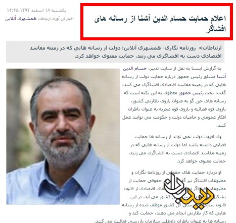 این موضع روحانی سریعا از سوی حسام الدین آشنا به یک سیاست رسانه ای تبدیل شد. سیاستی که افشاگری را رسمیت بخشیده و از خبرنگاران می خواهد با “پشتوانه دولت” در کارزار معرفی مفاسد (سیاسی – اقتصادی) بتازند: