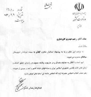 تا اینکه از اواخر سال 92 صحبتهای حضور حیدری به عنوان فرماندار سیاهکل مطرح شد.