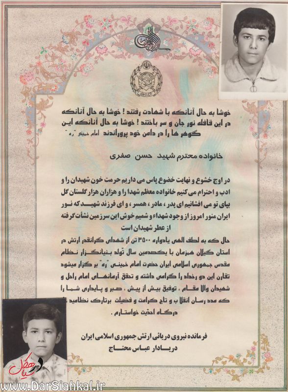 شهدا چشم وچراغ ملت ایران هستند خانواده شهدا ابروی کشور ما می باشند منظور عزیزان خدای ناکرده بی احترامی وفرق گذاشتن بین شهدا نیست به قولی چراغی که به خانه رواست به مسجد حرام است قرار بود سایت در سیاهکل هر جمعه شهیدی را معرفی نموده ودر مورد زندگی ان شهید مطلب بنویسد ولی بیش از شش ماه است که فراموش کرده است ودر قبل هم که در مورد شهدا مطلب می نوشتند احیانا یا ناقص بوده ویا عکسها ی شهدا مربوط به ان شهید نبود و چه بسیار از خانواده های شهدا در همسایگی ما زندگی می کنند که دیگران خبر ندارن که ایشان خانواده شهید است وخیلی از شهدای سیاهکل بین مردم ناشنا خته هستند واگر از دانش اموران مدارس سیاهکل بون مقدمه سوال شود که اسم ده شهید منطقه را نام ببرند خیلیها اسامی شهدا را نمی دانند ووظیفه این سایت در درجه اول شناساندن شهدای شهرستان به مردم وبعد شهرستانهای دیگر چون درشهر ما تنها سایت فعال همین سایت می باشد که اگر از شهدای شهرستان غفلت کند مردم چگونه شهدای شهر خود را بشناسند واز بنیاد شهید هم فعالیتی انچنانی ندیدیم .درمورد کوچه ای که نام بردهاند که اسم شهید صفری را دارد ان شهید ایرج صفری می باشد.