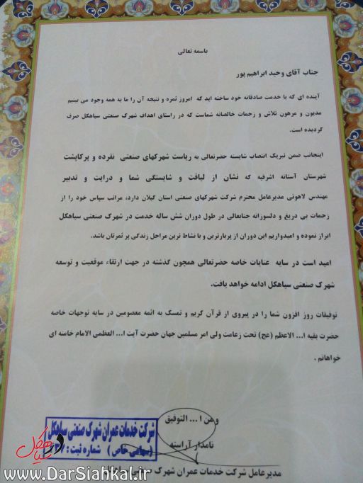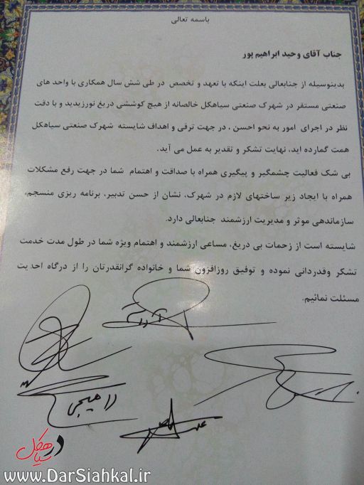 بسیار متاسفم برای اقای که بنام کارخانه داران از اقای ابراهیم پور تشکر وقدر دانی کردند اگر چند ماه دیگر ایشان می موندند …………….. جا دارد از هیت امنای شهرک تشکر کنم که با بضاعت بسیار کم زحمت زیادی برای شهرک کشیدند
