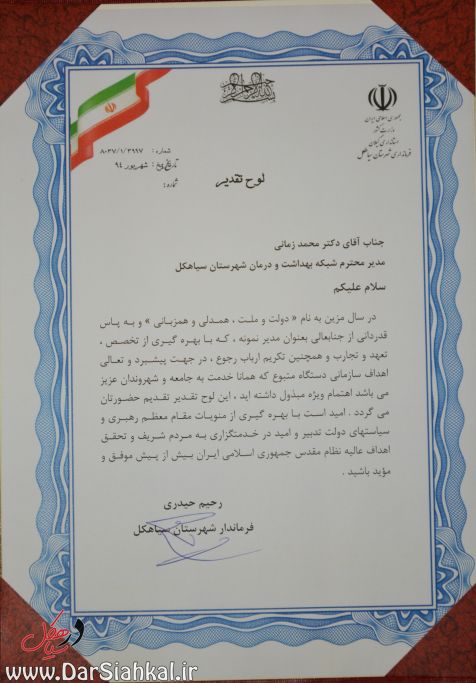 با تبریک به مدیر شبکه بهداشت ودرمان شهرستان سیاهکل،انتخاب ایشان از بین مدیران شهرستان به عنوان مدیر نمونه ،انتخاب شایسته ای بوده است؛انتظار است توجه ویژه به مراکز بهداشتی که دارای فضای فیزیکی نامناسب هستند داشته باشند