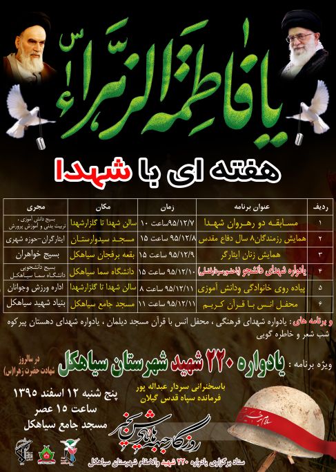 سرهنگ خوشحال افزود: ویژه برنامه این هفته یادواره ۲۲۰ شهید والامقام شهرستان سیاهکل در ساعت ۱۵ هشتم اسفندماه در سالروز شهادت بی بی دو عالم حضرت زهرا(س) می باشد که با سخنرانی سردار عبدالله پور فرمانده سپاه قدس گیلان در مسجد جامع سیاهکل برگزار می شود.