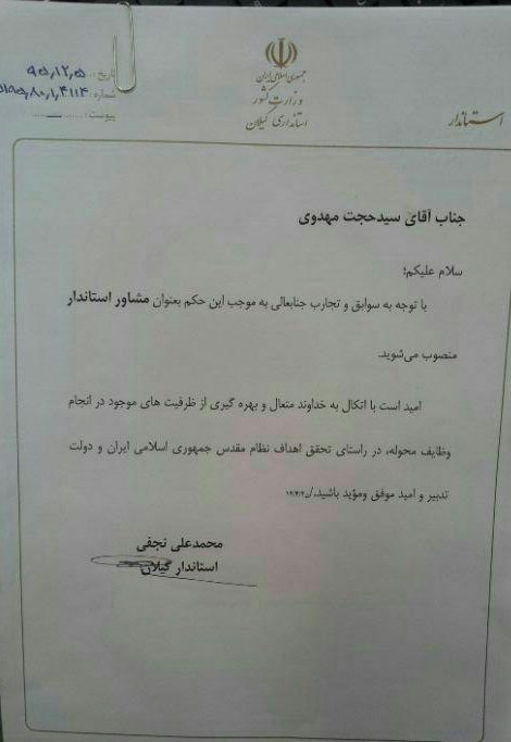طی حکمی از سوی دکتر محمد علی نجفی نماینده عالی دولت در گیلان دکتر سیدحجت مهدوی سعیدی به عنوان «مشاور استاندار گیلان» منصوب شد.