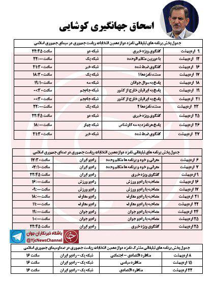 در زیر تصاویر برنامه های تلویزیونی و رادیویی صداوسیما برای تبلیغات کاندیداهای ریاست جمهوری را مشاهده می کنید. عضویت کانال تلگرام در سیاهکل