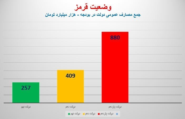 این در حالی است که مصارف عمومی دولت در بودجه‌های سال ۸۸ تا ۹۱ بیش از ۴۰۹ هزار میلیارد تومان و در بودجه‌های سال ۸۴ تا ۸۷ نیز ۲۵۷ هزار میلیارد تومان بوده است، بنابراین در دولت یازدهم ۲ برابر دولت دهم و ۱٫۵ برابر مجموع دو دولت نهم و دهم صرف بودجه عمومی شده است.