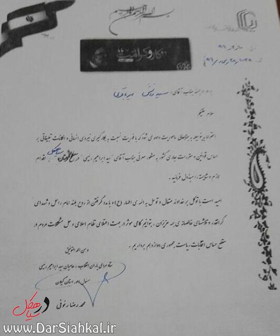 احتراما بدینوسیله به جنابعالی مأموریت داده می شود که با فوریت نسبت به بکارگیری نیروی انسانی و امکانات تبلیغاتی بر اساس قوانین و مقررات جاری کشور به منظور معرفی جناب آقای سید ابراهیم رئیسی در سطح شهرستان سیاهکل اقدام لازم و شایسته را مبذول فرمائید.