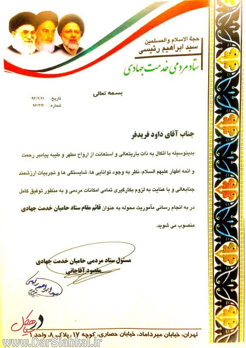 به گزارش درسیاهکل، با حکم مهدی سعادتی و مقصود آقاجانی؛ داود فریدفر به عنوان «مسئول کمیته نخبگان متخصصین» و «قائم مقام ستاد حامیان خدمت جهادی» سید ابراهیم رئیسی در کشور شد.