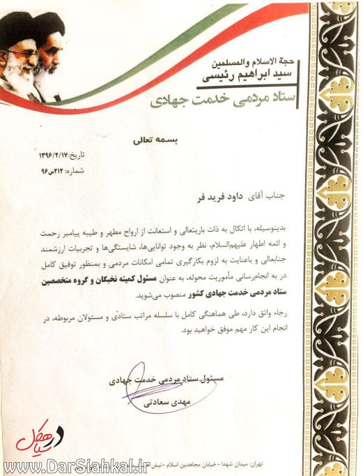 بدینوسیله، با اتکال به ذات باریتعالی و استعانت از ارواح مطهر و طیبه پیامبر رحمت و ائمه اطهار علیهم السلام، نظر به وجود توانایی ها، شایستگی ها و تجربیات ارزشمند جنابعالی و باعنایات به لزوم بکارگیری تمامی امکانات مردمی و بمنظور توفیق کامل در به انجام رسانی مأموریت محوله، به عنوان مسئول کمیته نخبگان متخصصین ستاد مردمی خدمت جهادی کشور منصوب می شوید.